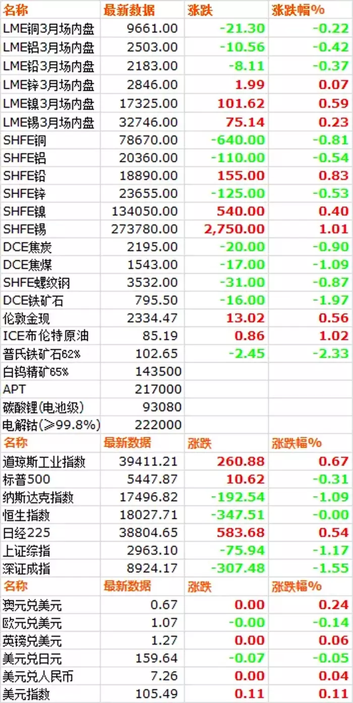 6月24日,LME六种基本金属价格涨跌互现,涨跌幅度都有限。三月期铜价收于9661美元/吨,下跌0.22%。三月期铝价收于2503美元/吨,下跌0.42%。三月期铅价收于2183美元/吨,下跌0.37%。三月期锌价收于2846美元/吨,上涨0.07%。三月期锡价收于32746美元/吨,上涨0.23%。三月期镍价收于17325美元/吨,上涨0.59%。