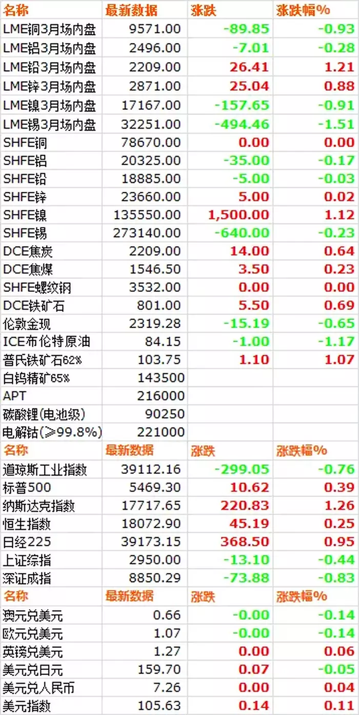 6月25日,LME六种基本金属价格跌多涨少,铅锌小幅上涨,锡领跌。三月期铜价收于9571美元/吨,下跌0.93%。三月期铝价收于2496美元/吨,下跌0.28%。三月期铅价收于2209.5美元/吨,上涨1.21%。三月期锌价收于2871美元/吨,上涨0.88%。三月期锡价收于32251美元/吨,下跌1.51%。三月期镍价收于17167美元/吨,下跌0.91%。