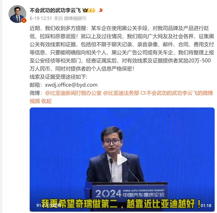 不知道李瑞峰的回应是针对李云飞的“打牌论”,还是针对比亚迪悬赏500万征集黑公关的线索,此言论一出,两家车企迅速进入“剑拔弩张”的状态。因为李瑞峰的言论是在新一代哈弗H6的发布现场说出的,在新车发布会现场不把主要精力放在产品演示上,而对“友商”进行20分钟的火力输出,也被众多网友评论为:“分不清重点,格局不够,太小家子气。”