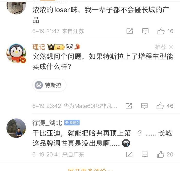 评论区有网友直言称:“长城有Loser味”,也有网友称“长城品牌调性没出息”,还有网友给长城进行善意提醒:“王传福就是因为长城搞事情,才把方程豹的价格定这么低来弄坦克,现在长城还敢这样搞,宋L DM-i看起来价格要爆炸了。”