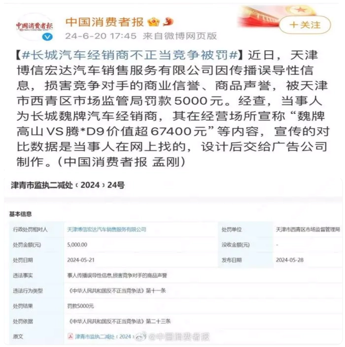 就在李瑞峰一直声称行业有人在牌桌上出老千,造成不公平竞争之时,《中国消费者报》第二天就曝出了劲爆消息,丝毫没有给李瑞峰面子。《中国消费者报》官微6月20日消息,长城汽车经销商天津博信宏达汽车销售服务有限公司因传播误导性信息,损害竞争对手的商业信誉、商品声誉,被天津市西青区市场监管局罚款5000元。当然这点钱对长城起来说九牛一毛,但昨天说友商不正当竞争“出老千”,一天后就被官媒反转,这对长城汽车的商誉损害极大。