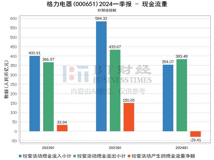 然而,现金流量数据则显示出一些问题。2024年第一季度,格力电器的经营活动产生的现金流量净额为-29.41亿元,而上年同期为150.65亿元,下降了119.52%。这一显著下降主要是由于销售商品、提供劳务收到的现金减少所致。尽管经营活动现金流入小计为354.07亿元,但现金流出小计高达383.48亿元,导致净现金流为负。需要注意的是,现金流量的显著下降可能会对公司的短期流动性产生一定压力,需要公司管理层采取有效措施进行应对。