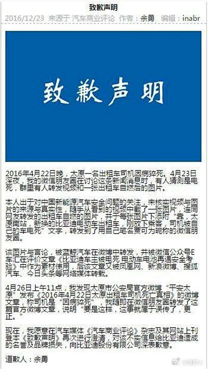 先不说贾可致歉声明的诚意如何,仅从一个媒体人的职业操守出发,在没经证实就散布不利于比亚迪企业形象的言论,就已经失去了客观和严谨。而贾可在8个月后才姗姗来迟的“致歉声明”,足以说明他承认自己此前“未核实”、“随手”和“随即”所发布的内容(致歉声明见下图)属于造谣,否则他也不会公开致歉。