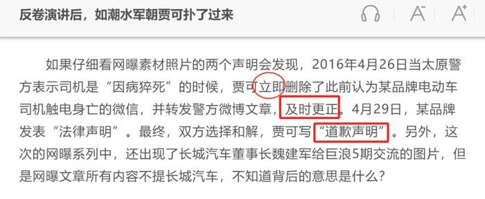 从《汽车商业评论》在6月28日早上7点04分发布《反卷演讲后,如潮水军朝贾可扑了过来》上来看,作为总编辑,贾可并未认为自己当年的造谣侵权行为之恶劣,文章轻描淡写的用了“立即删除”和“及时更正”甚至连贾可写道歉声明都使用了双引号。