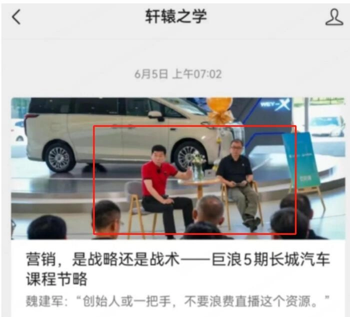 巧合的是,在该论坛结束不久,长城汽车的新车发布会上,李瑞峰突然和贾可的“指向性指桑骂槐”保持了一致,甚至要“掀桌子”。贾可和长城汽车的关系如何,不得而知。但从6月5日轩辕之学发布的《营销,是战略还是战术——巨浪5期长城汽车课程节略》一文中可以看到长城董事长魏建军的身影,魏建军和贾可并排而坐,魏建军在百忙之中能去参加贾可举办的活动,那应该是相当给贾可老师面子。而结合长城去年举报比亚迪,最近又由“打牌论”到“掀桌子”,贾可在此精妙的时间发声,两者有何关联,广大网友或许自有判断。