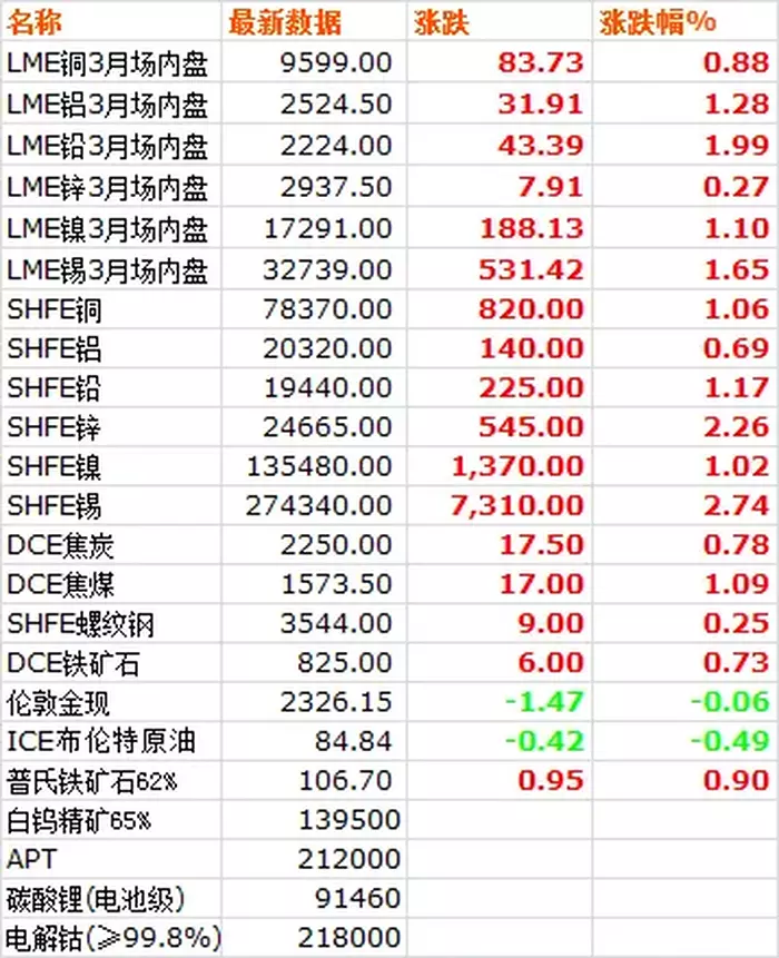 6月28日,LME六种基本金属价格全线上涨,铅领涨大盘,锡铝涨幅居前。三月期铜价收于9599美元/吨,上涨0.88%。三月期铝价收于2524.5美元/吨,上涨1.28%。三月期铅价收于2224美元/吨,上涨1.99%。三月期锌价收于2937.5美元/吨,上涨0.27%。三月期锡价收于32739美元/吨,上涨1.65%。三月期镍价收于17291美元/吨,上涨1.10%。