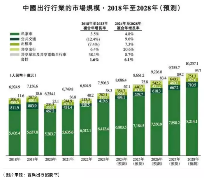 曹操出行、如祺和嘀嗒的扎堆上市,除了和自身亏损经营压力巨大之外,还和中国网约车市场规模有关。公开资料显示,中国目前是全球最大的出行市场,2023年的市场规模已经达到了7.5万亿元,同比增长8.9%。曹操出行预测,2024年,中国出行行业将达到8.1万亿元,同比增长8%。2028年,中国出行市场规模将增长至10.3万亿元,年复合增长率6.1%。属于高增长行业。