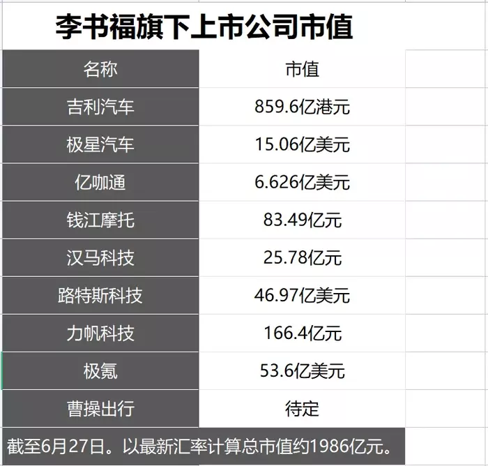 不出太大意外,曹操出行将成为李书福的第10家上市公司。此前李书福旗下的上市公司有吉利汽车、极星汽车、亿咖通、钱江摩托、汉马科技、路特斯科技、力帆科技、极氪等8家,曹操出行顺利上市的话,李书福将成为拥有上市公司数量最多的车企掌门人。截至6月27日,已经上市的公司,以最新汇率计算总市值约1986亿元。