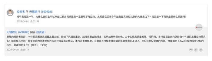 小股东提出反对意见,是因为对比全行业,无锡银行的分红比例确实较低。据证券之星盘点,42家A股上市银行中,分红比例在30%以上的有二十多家,无锡银行的分红比例排名靠后。在投资平台上,有自称已经持有公司股票一年的投资者咨询,为什么分红比例一直下降?对此无锡银行回应,确定分红水平是出于审慎角度,在兼顾可持续发展和满足监管要求,并充分权衡了投资者的利益。