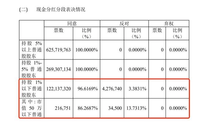 对于这一分红方案,不少小投资者在股东大会审议环节投下了反对票。5月11日,无锡银行公告的现金分红分段表决情况结果显示,有3.38%的持股1%以下普通股股东、13.73%的市值50万元以下普通股股东提出反对意见。
