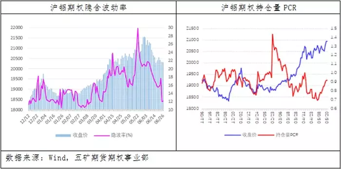 市场情绪偏中性,预期铝价7月主要在20000-22000元/吨区间运行。6月伴随铝价快速回落,沪铝期权隐含波动率快速大幅下跌,6月26日报收于12.13%,市场预期铝价经历一个月快速下跌后,继续大幅下跌风险降低,区间震荡概率较高。从沪铝期权最大持仓量所在行权价来看,6月26日,al2408合约看跌期权最大持仓量所在行权价为20000元/吨,期权费120元/吨,看涨期权最大持仓量所在行权价为22000元/吨,期权费14元/吨,市场预期7月铝价主要在20000-22000元/吨区间运行。从期权持仓量来看,6月26日,看跌期权持仓量25990张,较上月同期减少30269张;看涨期权持仓量29009张,较上月同期减少41041张;持仓量PCR小幅下滑报收于0.90,略低于多空情绪临界值1.00,市场情绪偏中性。