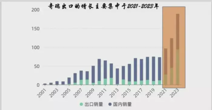 2005年以前,奇瑞的出口占比不算高,但奇瑞在第三世界的知名度颇高,保持了每年十几万辆的出口节奏。直到2020年,海外出口的占比也几乎没有超过三分之一。但自2021年起,奇瑞出口销量激增,海外市场占比逐渐攀升至一半左右,成为国内海外市场业务占比最高的车企。