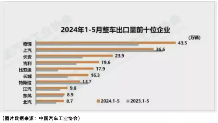 截至2024年5月31日,奇瑞出口量达到43.5万辆,再次卫冕中国车企出口冠军。排名第二的是上汽集团的36.6万辆,长安以23.9万辆排在第三,吉利以19.6万辆排在第四。