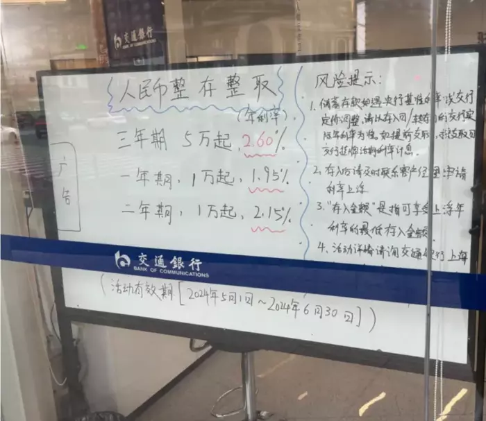 以交通银行为例,1年期1.95%,2年期2.15%,3年期2.60%,其中1年期和2年期需1万元起存,3年期需5万元起存。其他国有大行的存款利率也明显偏低,工行、建行、中行定存利率均为1年期1.7%,2年期1.9%,3年期2.35%。