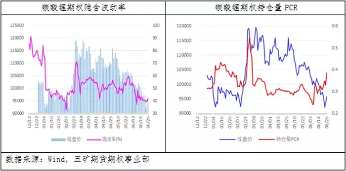 市场看跌情绪仍然浓厚,预期7月碳酸锂价格主要在8.5-10万元/吨区间运行。5月以来,碳酸锂期权隐含波动率持续大幅下降,6月降至较低位置,6月26日报收于41.96%。从碳酸锂期权最大持仓量所在行权价来看,6月26日,LC2408合约看跌期权最大持仓量所在行权价为8.5万元/吨,期权费120元/吨,看涨期权最大持仓量所在行权价为12万元/吨,期权费60元/吨,第二大持仓量所在行权价为10万元/吨,市场预期7月碳酸锂价格主要在8.5万元-10万元/吨区间运行。从期权持仓量来看,6月26日,看跌期权持仓量70370张,较上月同期大幅增加57108张;看涨期权持仓量157292张,较上月同期增加87882张;卖出看涨期权持仓量同比增加量较多,导致持仓量PCR小幅盘整收于0.39,位于多空情绪临界值1.00以下且处于较低位置,市场看跌情绪仍然浓厚。