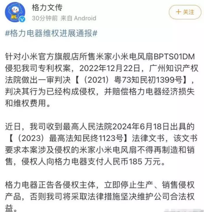 据《每日经济新闻》、《上海证券报》、《中国证券报》、《红星新闻》等多家权威媒体报道,7月9日晚,格力文传在官微发文称,格力电器收到最高人民法院2024年6月18日出具的【(2023)最高法知民终1123号】法律文书,该文书要求本案涉及侵权的米家小米电风扇不得再制造和销售,侵权人向格力电器支付人民币185万元。