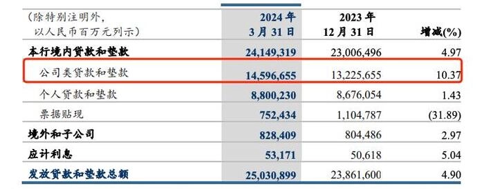 2024年一季度末,建行发放贷款和垫款总额25.03万亿元,较2023年末增加了1.17万亿元,增长4.90%。对公业务在其中起到了支撑性的作用,公司类贷款和垫款较2023年末的增速高达10.37%。新增贷款投向围绕“五篇大文章”,在普惠、绿色等方向均维持较大投放力度。