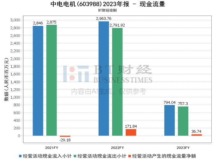 现金流量数据显示,中电电机在2023年的经营活动产生的现金流量净额为36.74百万元,实现了从负到正的显著转变,表明公司的自我造血能力得到了增强。投资活动产生的现金流量净额大幅减少并转为负数,显示公司在该年度减少了对外投资。筹资活动产生的现金流量净额亏损有所增加。