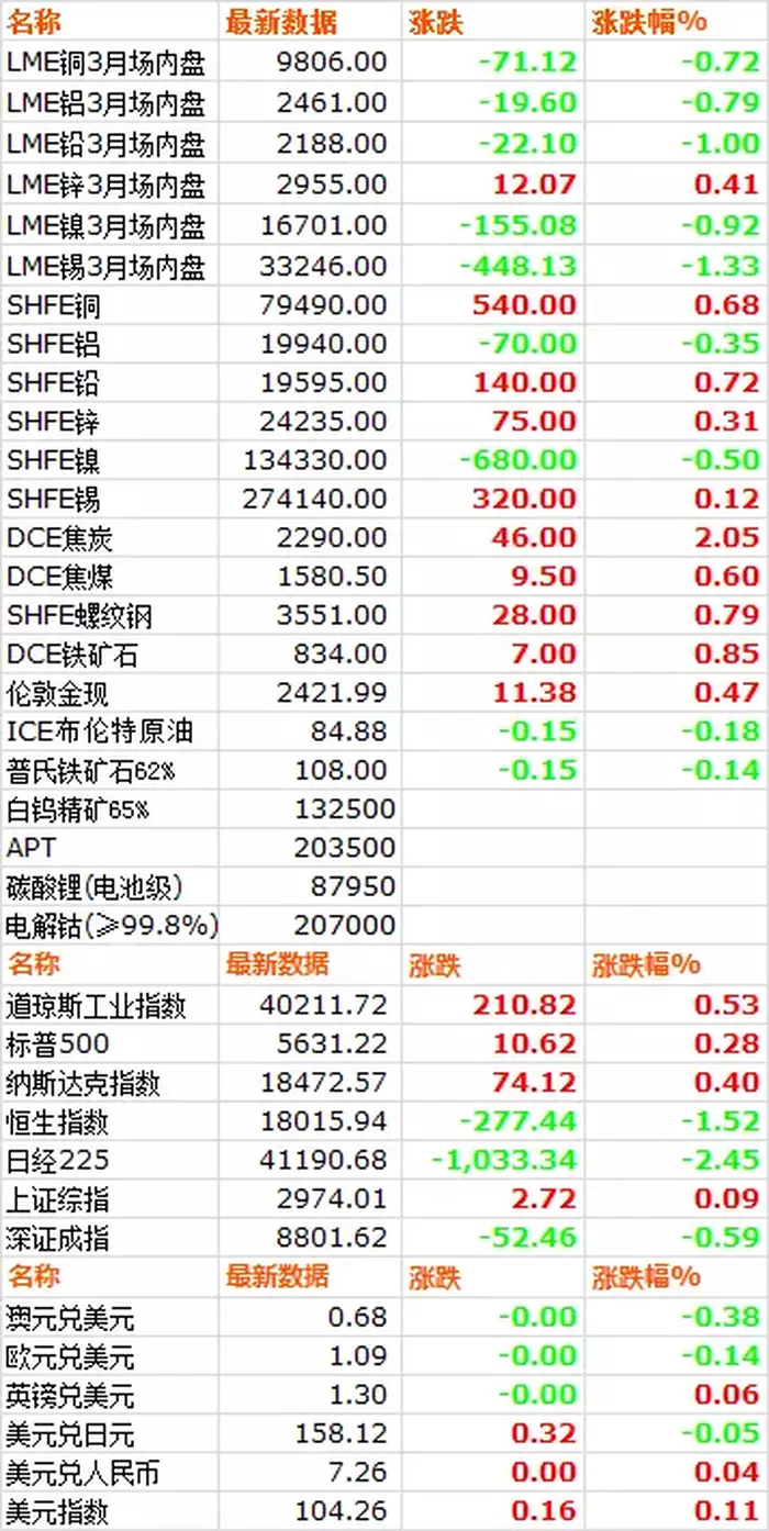 7月15日,LME六种基本金属价格跌多涨少,仅锌小幅上涨,锡铅跌幅居前。三月期铜价收于9806美元/吨,下跌0.72%。三月期铝价收于2461.5美元/吨,下跌0.79%。三月期铅价收于2188美元/吨,下跌1.00%。三月期锌价收于2955美元/吨,上涨0.41%。三月期锡价收于33246美元/吨,下跌1.33%。三月期镍价收于16701美元/吨,下跌0.92%。