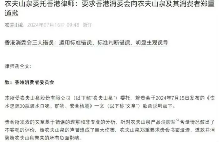 消息一经曝出后,农夫山泉和百岁山明确表达了不满,其中农夫山泉已经向香港消委会发出了律师函,要求消委会公开道歉。根据农夫山泉的律师函内容,香港消委会存在适用标准错误、标准判断错误、明显主观误导三大错误,要求香港消委会立即作出澄清、道歉并消除影响。百岁山法务部门在事发当日就已经在和香港消委会进行交涉。