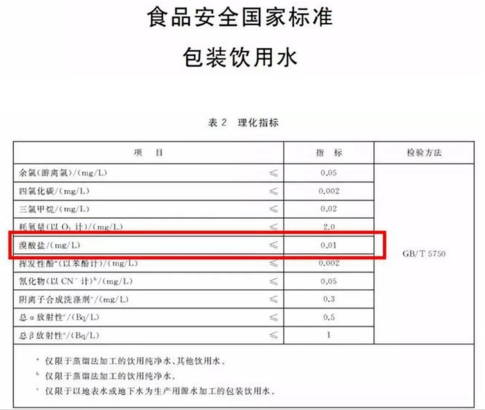 因此,各国对于饮用水中溴酸盐的含量均设有严格的限量标准。目前我国执行的限量标准为国家《食品安全国家标准包装饮用水》(GB 19298-2014)的标准,该标准规定饮用水中溴酸盐的限量为≤10微克/升。