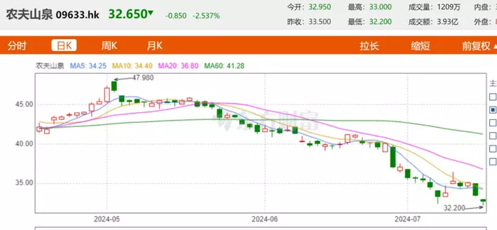 但农夫山泉的律师函并未打消资本的顾虑,截至7月16日收盘,农夫山泉股价继7月15日下跌4.65%后,再跌2.84%,32.550港元的股价已经创下近2年新低,实时总市值为3678亿港元,对比66.426港元的股价高点,农夫山泉股价已经下跌51%,市值蒸发了3703亿港元。