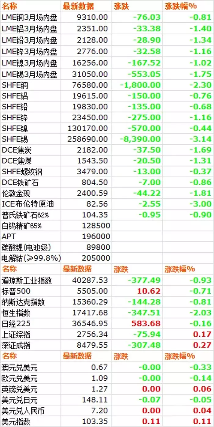 7月19日,LME六种基本金属价格全线下跌,锡领跌大盘。三月期铜价收于9310美元/吨,下跌0.81%。三月期铝价收于2351.5美元/吨,下跌1.40%。三月期铅价收于2128美元/吨,下跌1.34%。三月期锌价收于2776.5美元/吨,下跌1.16%。三月期锡价收于31050美元/吨,下跌1.75%。三月期镍价收于16256美元/吨,下跌1.02%。
