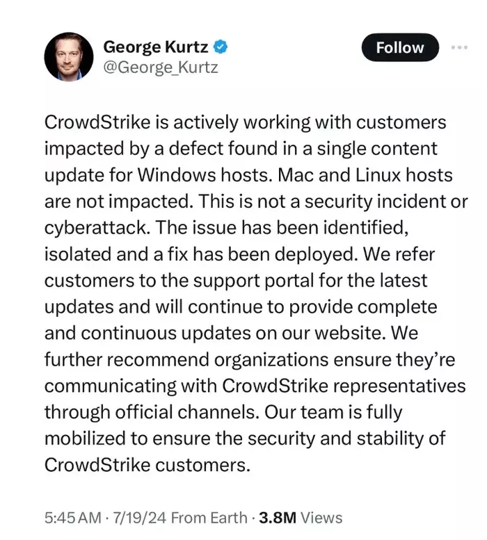 全球大宕机事故发生后,比这场技术灾难更令人震惊的,是CrowdStrike CEO那令人匪夷所思的应对方式。面对全球范围内的愤怒与混乱,他选择了一种令人难以置信的冷漠与回避态度,不仅没有直接承认错误或表达歉意,反而用一连串的官腔与模糊不清的措辞,试图将责任推向虚无缥缈的“内容更新”和“缺陷”,仿佛这一切都是上天的安排,而非人类决策的失误。