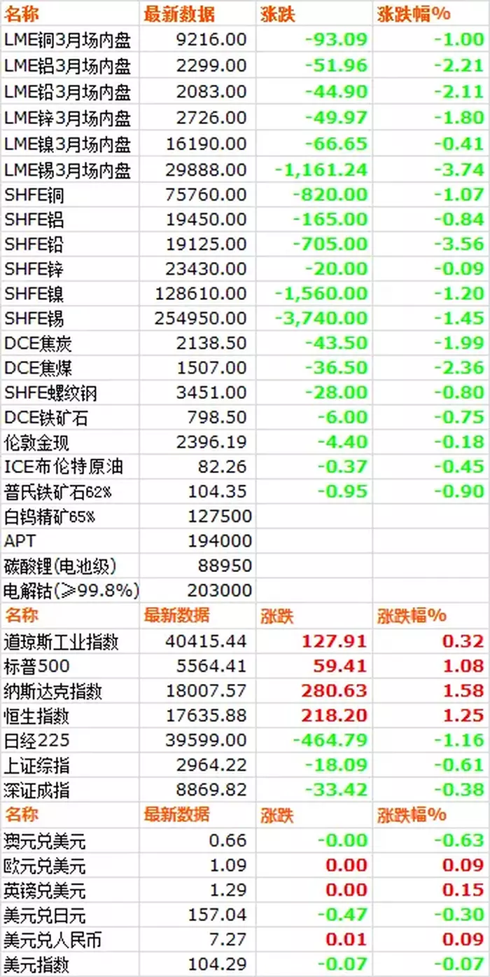7月22日,LME六种基本金属价格全线下跌,锡领跌大盘,铝铅跌幅居前。三月期铜价收于9216.5美元/吨,下跌1.00%。三月期铝价收于2299.5美元/吨,下跌2.21%。三月期铅价收于2083美元/吨,下跌2.11%。三月期锌价收于2726.5美元/吨,下跌1.80%。三月期锡价收于29888美元/吨,下跌3.74%。三月期镍价收于16190美元/吨,下跌0.41%。