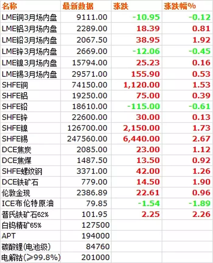 7月26日,LME六种基本金属价格涨多跌少,铜锌小幅下跌,铅领涨。三月期铜价收于9111美元/吨,下跌0.12%。三月期铝价收于2289美元/吨,上涨0.81%。三月期铅价收于2067.5美元/吨,上涨1.92%。三月期锌价收于2669美元/吨,下跌0.45%。三月期锡价收于29571美元/吨,上涨0.53%。三月期镍价收于15794美元/吨,上涨0.16%。