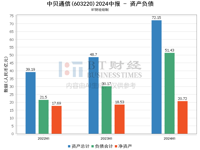 从资产负债数据来看,中贝通信总资产达到72.15亿元,较上年同期的61.4亿元增长了17.51%,表明公司资产规模持续扩大。同时,负债合计为51.43亿元,同比增长了24.28%,资产负债率由上年同期的67.28%上升至71.28%。尽管负债率有所上升,但仍处于可控范围内,反映了公司在扩张过程中合理的财务杠杆运用。