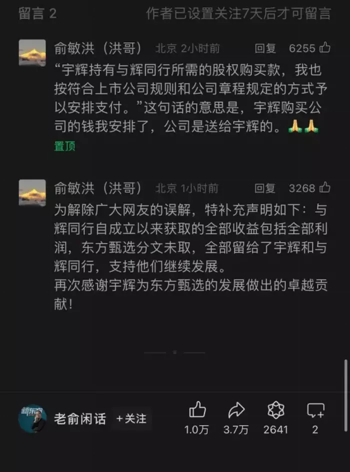 7月25日,董宇辉离任,俞敏洪表现得很慷慨大度,不仅将董宇辉从东方甄选彻底放手,还慷慨地将公司和利润都打了包送给了董宇辉。董宇辉则也在评论区表达了诚挚的谢意,双方最终和平分手。