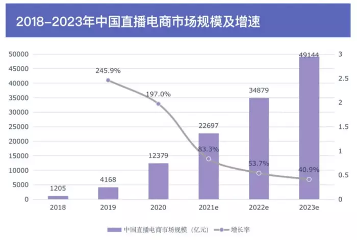 数据或能印证这种观点。艾瑞咨询数据显示,直播带货市场从2018年的1205亿增长至2023年的4.9万亿,6年间增速迅猛。但增长率下滑也很明显,从2019年245.9%的高增长率一路下跌,2023年增长率已经跌至40.9%,逐步进入稳定增长期。