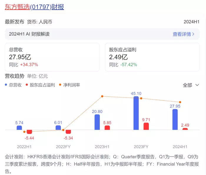 2024年一季报显示,东方甄选总营收为27.95亿元,同比增长34.37%;归母净利润为2.49亿元,同比下降57.42%,增收不增利。这其中或有负面舆情的影响,也和直播带货的整体大环境有关。