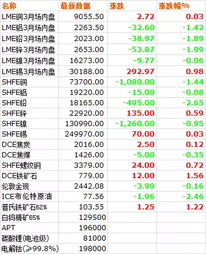 8月2日,LME六种基本金属价格跌多涨少,锡小幅上涨,铜几乎持平,锌领跌。三月期铜价收于9055.5美元/吨,上涨0.03%。三月期铝价收于2263.5美元/吨,下跌1.42%。三月期铅价收于2023美元/吨,下跌1.89%。三月期锌价收于2653美元/吨,下跌1.99%。三月期锡价收于30188美元/吨,上涨0.98%。三月期镍价收于16273美元/吨,下跌0.06%。