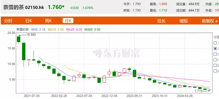 茶饮品牌的上市成功或非万能“解药”,从奈雪的茶上市后的表现来看,开盘破发、首次盈利仍然难阻股价大幅下跌,截至8月2日收盘,奈雪的茶股价为1.76港元,再跌1.676%,总跌幅91%,市值仅剩30.14亿港元。