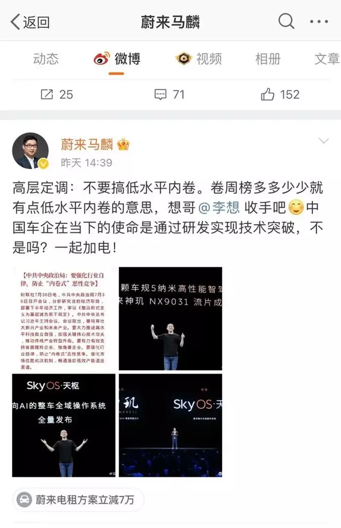 据《每日经济新闻》7月30日文章《理想周榜再引反对声音,蔚来高管:低水平内卷!吉利高级副总裁加入!》显示,理想也引发蔚来品牌与传播助理副总裁马麟的强烈不满,在社交媒体发文表态称“拒绝理想发布的周销量榜单”,并认为卷周榜是低水平的内卷。