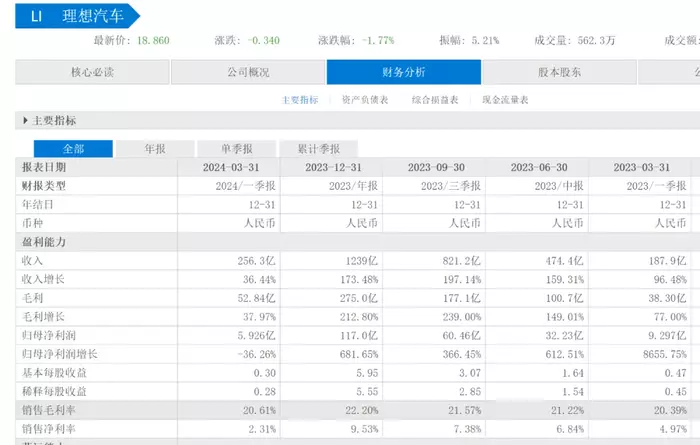 据财报显示,一季度理想的营收256.3亿元,同比增长36.44%。理想增收不增利,净利润5.926亿元,同比下滑36.26%。或和理想一季度的净利率大幅下滑有关,2023年一季度理想的净利率为4.97%,今年一季度的净利率只有2.31%,不到去年同期的一半。不过理想依然保持单季度利润为正,这已经是理想连续5个季度净利润为正。