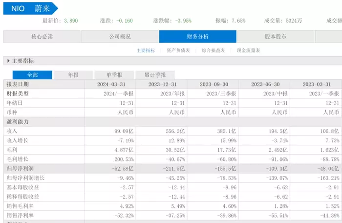 据财报显示,蔚来在一季度的营收为99.09亿元,同比下滑7.19%。净亏损为52.58亿元,同比扩大9.46%。蔚来一季度的毛利率有所提升,由去年同期的1.52%提升至4.92%,净利率却由去年同期的-44.39%下滑至-52.32%。