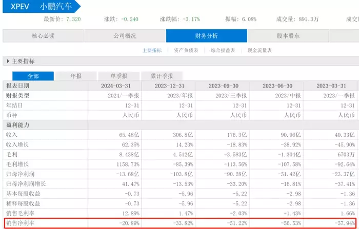 小鹏同期表现相对出色,据财报显示,营收为64.48亿元,同比增长62.35%,为三家中增长最高。净利润-13.68亿元,相比去年同期的-23.37亿元,收窄41.47%。值得肯定的是,小鹏的销售毛利率由去年同期的1.66%提升至12.89%,净利率也由去年同期的-57.94%提升至-20.89%。