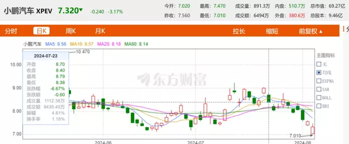 何小鹏的焦虑或从股价上可以窥见一斑。小鹏汽车7月23日单日跌幅高达6.67%。8月1日,小鹏美股再度下跌5.53%,总市值仅为72亿美元,市值较高点蒸发了630亿美元,跌幅近九成。截至8月5日收盘,小鹏美股股价为7.320美元,跌幅已经超过九成。