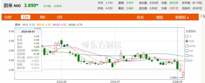 近日,蔚来美股股价也出现大跌,8月1日收盘股价为4.06美元,单日大跌8.56%。至此蔚来股价较高点跌幅已经达94%,市值蒸发了1313亿美元,此时蔚来市值仅剩84.7亿美元。截至8月5日收盘,蔚来股价再跌3.95%,总市值为81.19亿美元。