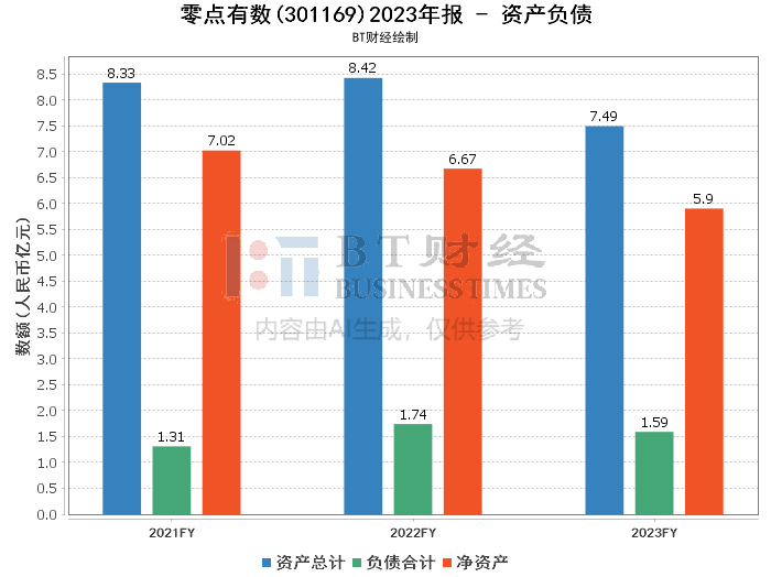 2023年末,零点有数的资产总额为7.49亿元,较2022年末的8.42亿元减少了11.02%。归属于上市公司股东的净资产为5.83亿元,较2022年末的6.53亿元减少了10.62%。资产负债率从2022年末的20.72%上升至2023年末的21.2%。公司的货币资金从2022年末的5.37亿元减少至2023年末的4.63亿元,主要原因是报告期内加大了募投项目投入和新增对外股权投资。应收账款从2022年末的88.2百万元增加至2023年末的1.13亿元,反映了营业收入的增长带动了期末应收账款的增加。