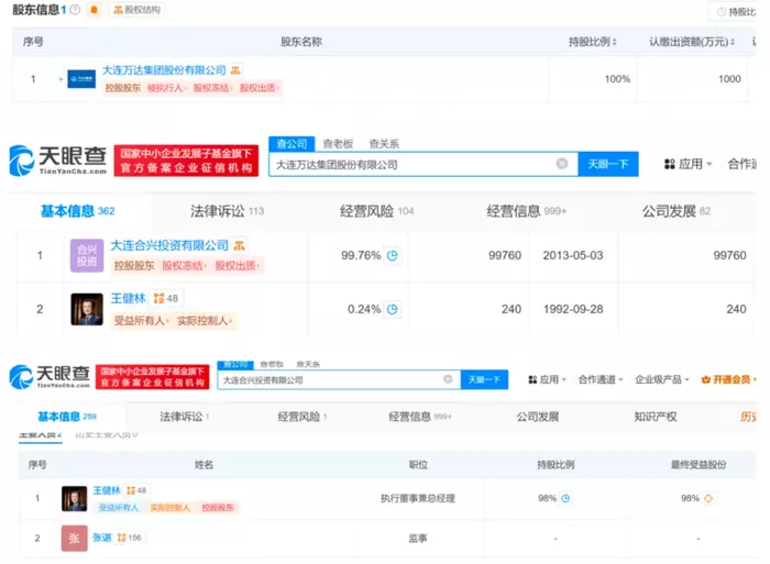 从天眼查透过股权穿透可以发现,大连万达集团股份有限公司持有珠海盛新企业管理有限公司100%的股权,大连万达集团股份有限公司第一大股东为大连合兴投资有限公司,持股99.76%,王健林为第二大股东,持股0.24%。再次股权穿透可知,王健林持有大连合兴投资有限公司98%的股权,如此推算,王健林持有珠海盛新企业管理有限公司99%左右的股权,为实际控制人。