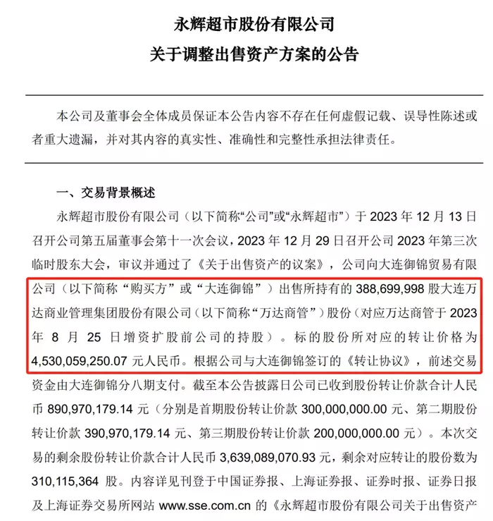 7月27日,永辉超市发布公告称,准备对出售大连万达商业管理集团股份有限公司(以下简称“万达商管”)股份的方案作出调整。本次转股剩余的股份转让价款总计人民币38.4亿元,将分成8期来完成,付款周期由2024年6月30日至2026年3月31日,跨度长达一年零九个月,较之前延长了半年。