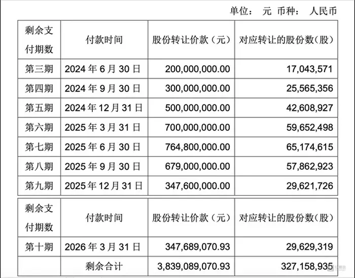 永辉超市在公告中表示,因购买方目前存在短期资金周转困难,其正积极处置资产以回笼资金用以支付本次交易股份转让价款。具体八期分期为第三期至第九期,首次(第三次)为2024年6月30日,首次支付金额为2亿元,随后每3个月为一次分期,对应支付金额为3亿元、5亿元、7亿元、7.648亿元、6.97亿元、3.476亿元和3.48亿元。
