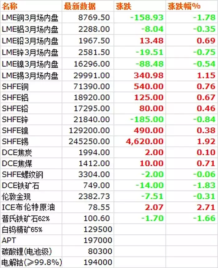 8月7日,LME六种基本金属价格跌多涨少,铅锡上涨,铜领跌。三月期铜价收于8769.5美元/吨,下跌1.78%。三月期铝价收于2288美元/吨,下跌0.35%。三月期铅价收于1967.5美元/吨,上涨0.69%。三月期锌价收于2581.5美元/吨,下跌0.75%。三月期锡价收于29991美元/吨,上涨1.15%。三月期镍价收于16296美元/吨,下跌0.54%。