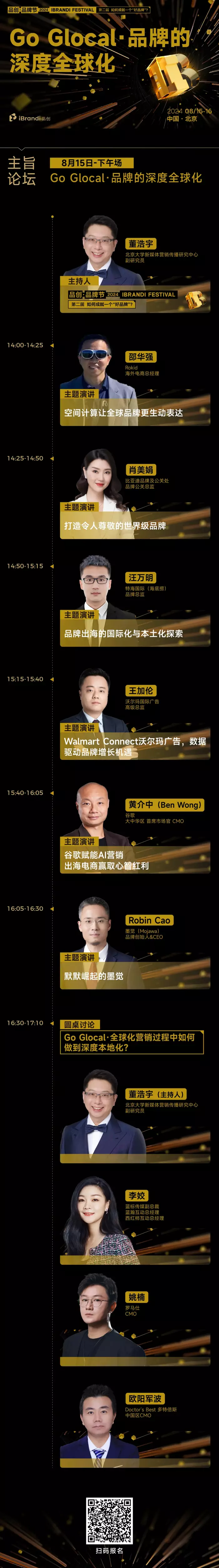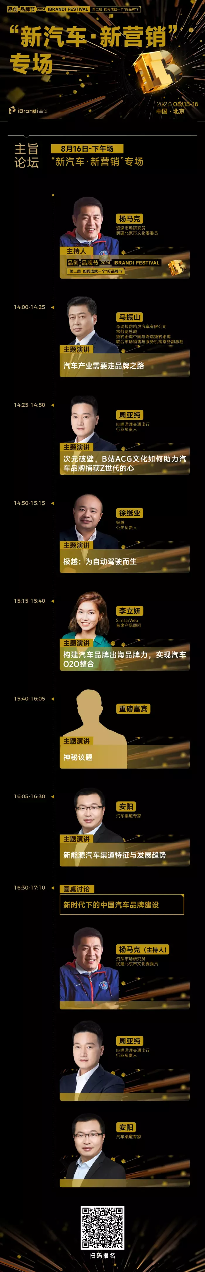 8月15-16日两天,将设5大分会场,话题贯穿:国际品牌宏观趋势、品牌深度全球化、中国产品到中国品牌、品类之王和细分之王突围,以及新汽车·新营销,内容涵盖40+场的主题演讲+圆桌讨论。