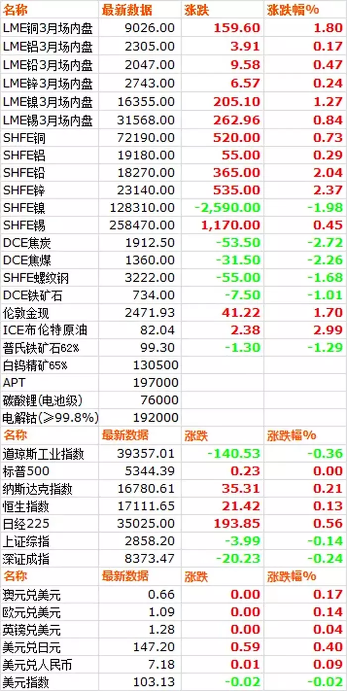 8月12日,LME六种基本金属价格全线上涨,铜领涨大盘。三月期铜价收于9026.5美元/吨,上涨1.80%。三月期铝价收于2305.5美元/吨,上涨0.17%。三月期铅价收于2047.5美元/吨,上涨0.47%。三月期锌价收于2743美元/吨,上涨0.24%。三月期锡价收于31568美元/吨,上涨0.84%。三月期镍价收于16355美元/吨,上涨1.27%。