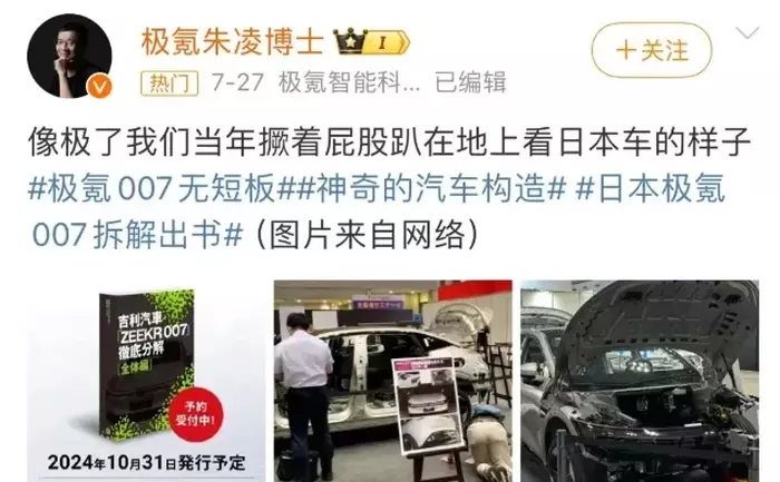 这一幕被极氪副总裁朱凌获悉,朱凌在微博上写道:(这一幕)“像极了我们当年撅着屁股趴在地上看日本车的样子。”